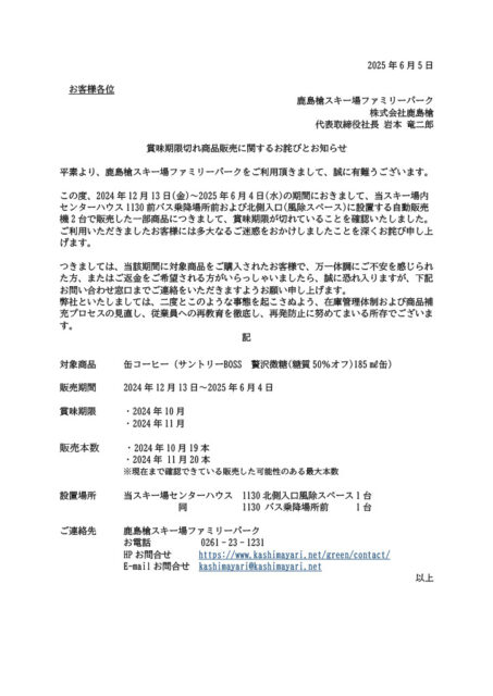 賞味期限切れ商品販売に関するお詫びとお知らせ